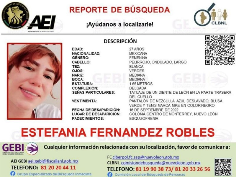 El Grupo Especializado de Búsqueda Inmediata (GEBI) de la Agencia Estatal de Investigaciones activó un reporte de búsqueda para dar con el paradero de una joven de 27 años de edad, que desapareció en el centro de Monterrey, en Nuevo León.