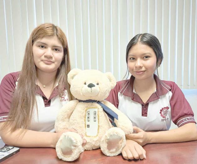 Dos alumnas del CETIS 71 presentaron al oso Braulio, diseñado para ayudar a niños con discapacidad visual